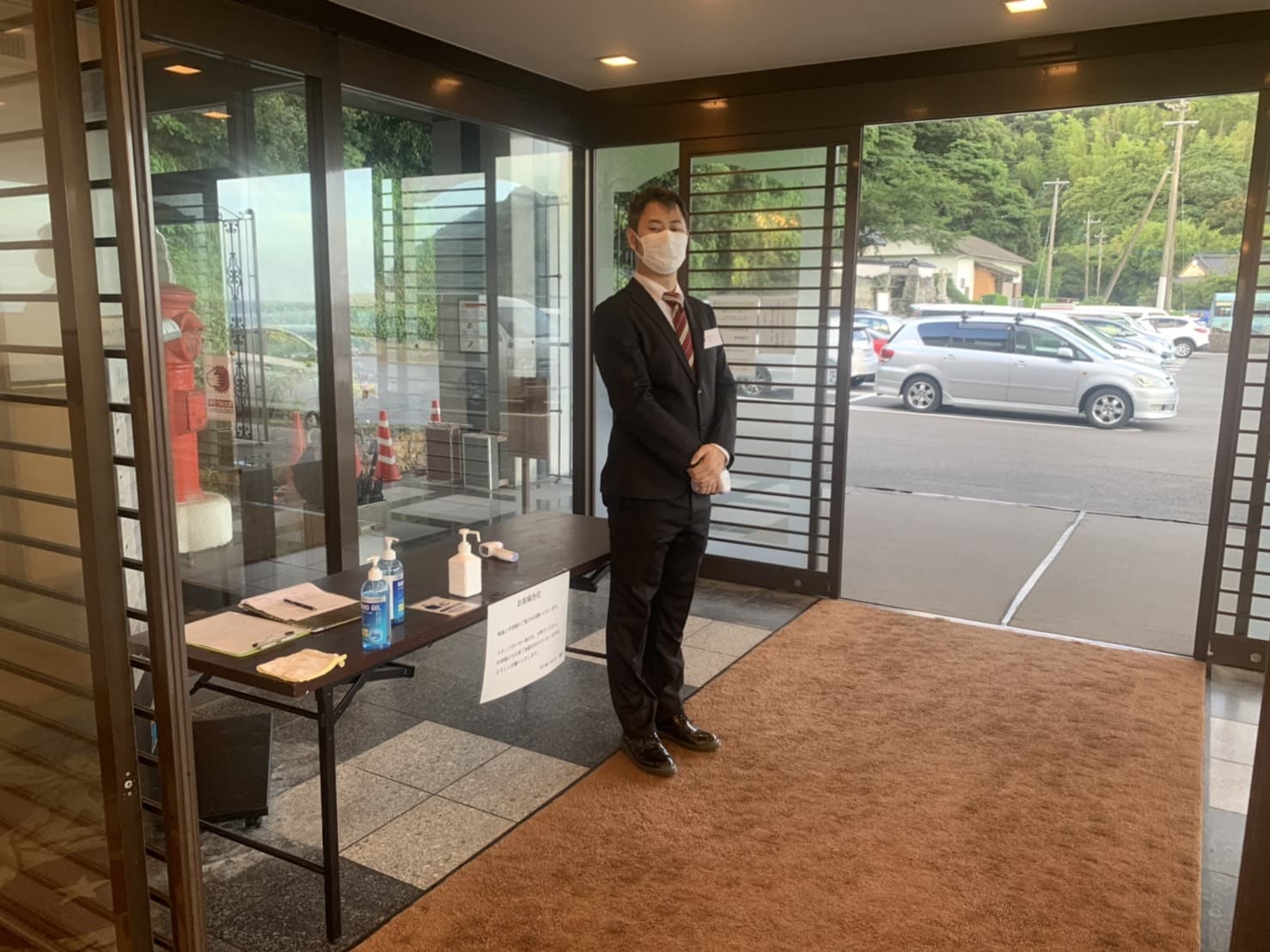 入館時の体温チェック、手の消毒
